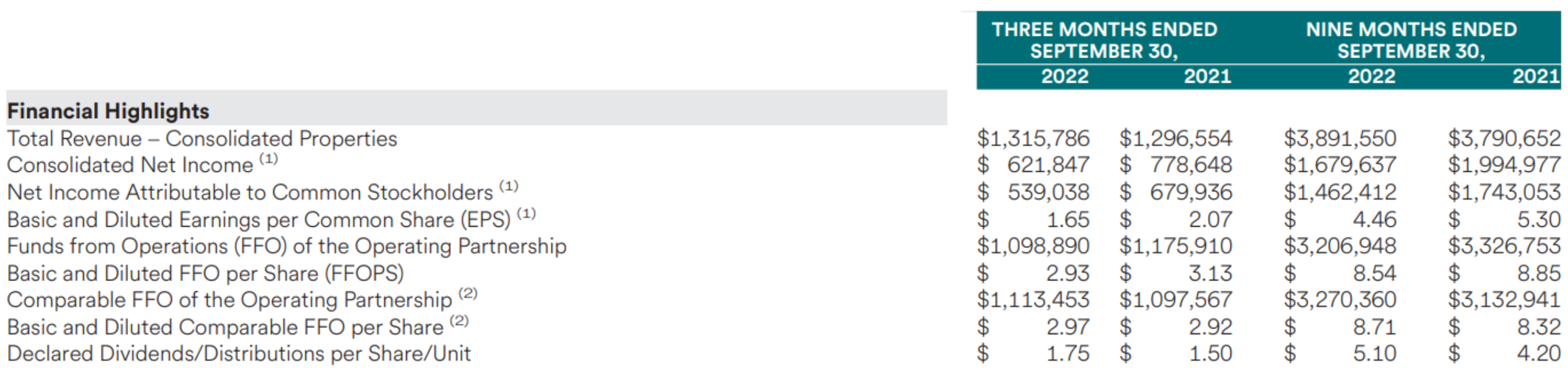 For some perspective on the dividend strength, the following table shows SPG pays out just 59% of its FFO per share in dividends.
