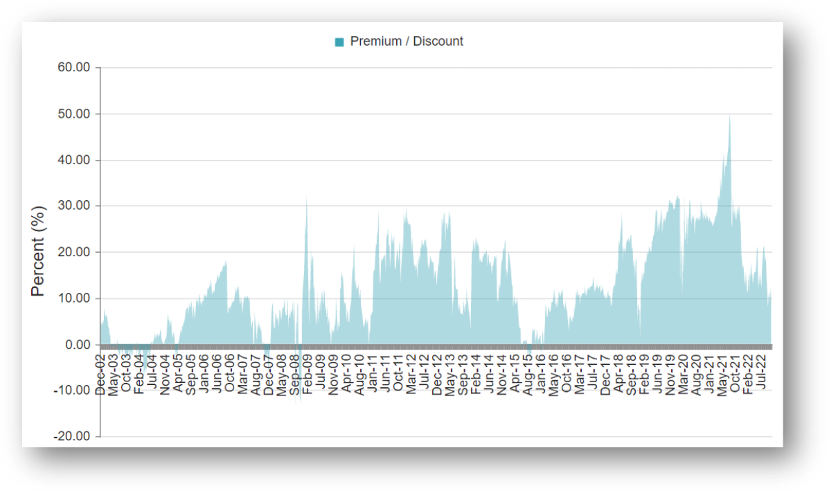 And as the NAV has faced serious downward pressure when covid hit and again more recently as rates have been rising (remember, when rates go up, bond prices go down, all else equal), PTY’s once enormous price premium has fallen, as you can see above and in this next chart.