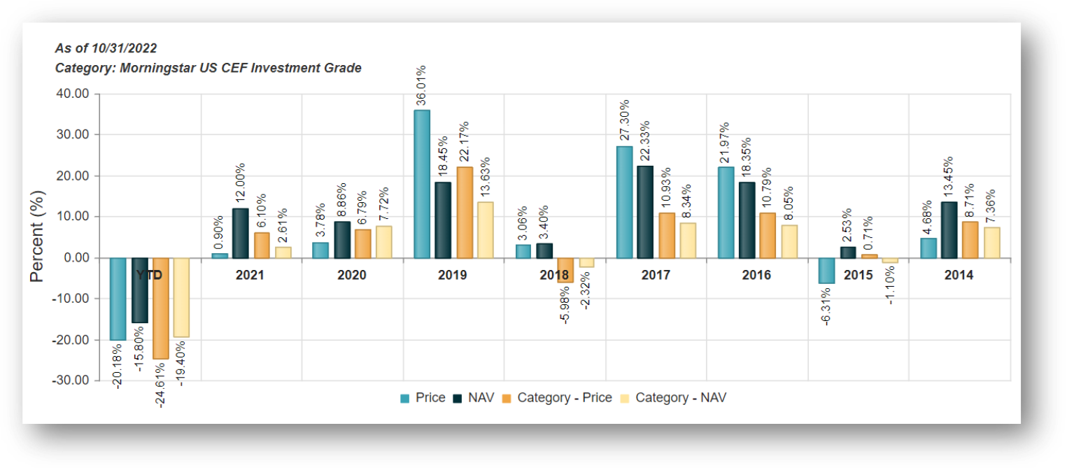 Another interesting characteristic is that CEFs can also use varying degrees of leverage (or borrowed money); this can magnify the income and total returns in the good times, but also magnify the pain in the bad times (like this year).