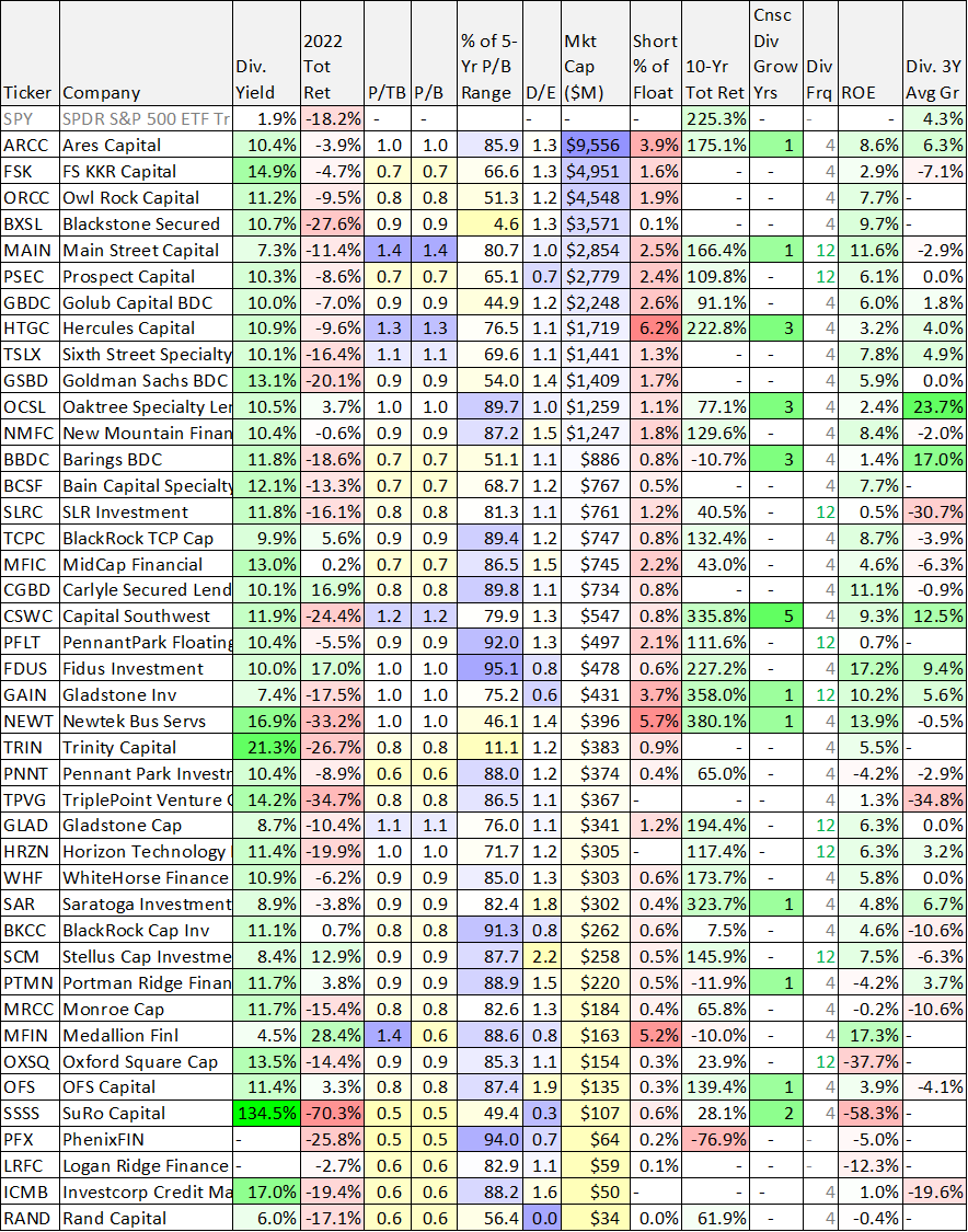 For your reference, here is a look at current data on over 40 big-dividend BDCs, including yields, returns, valuation metrics (price-to-book), market capitalizations, and more.