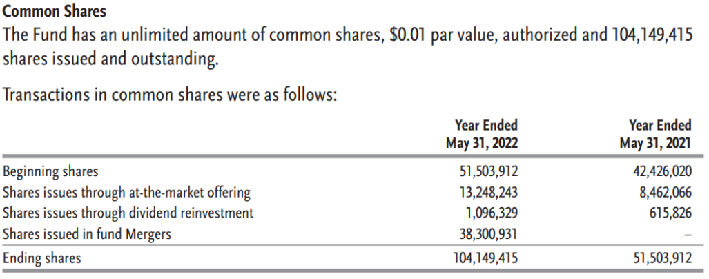 To add a little color on the share issuances, some came from shares issued for a recent fund merger (two other Guggenheim funds merged with GOF in late 2021, and investors in the old funds had their shares replaced with new shares of GOF), some came from GOF’s dividend reinvestment program (more on this momentarily) and some came simply from GOF offering new shares in the public market at a price premium (a good thing—almost a bit of an “arbitrage,” some investors might argue).