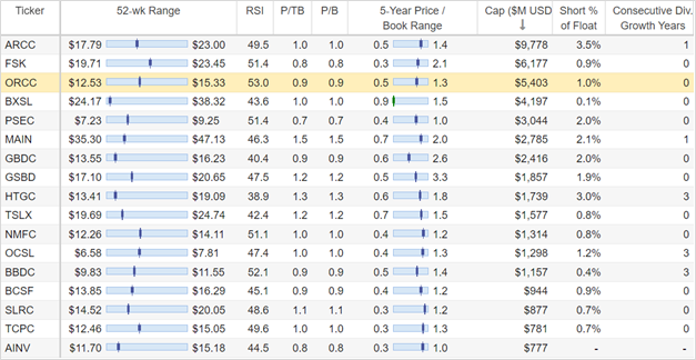 One of the most common ways to value BDCs (as well as big banks, for that matter) is to consider current price-to-book value multiple. Here is a look at the metric for Owl Rock (as well as a variety of additional BDCs, sorted by market cap).
