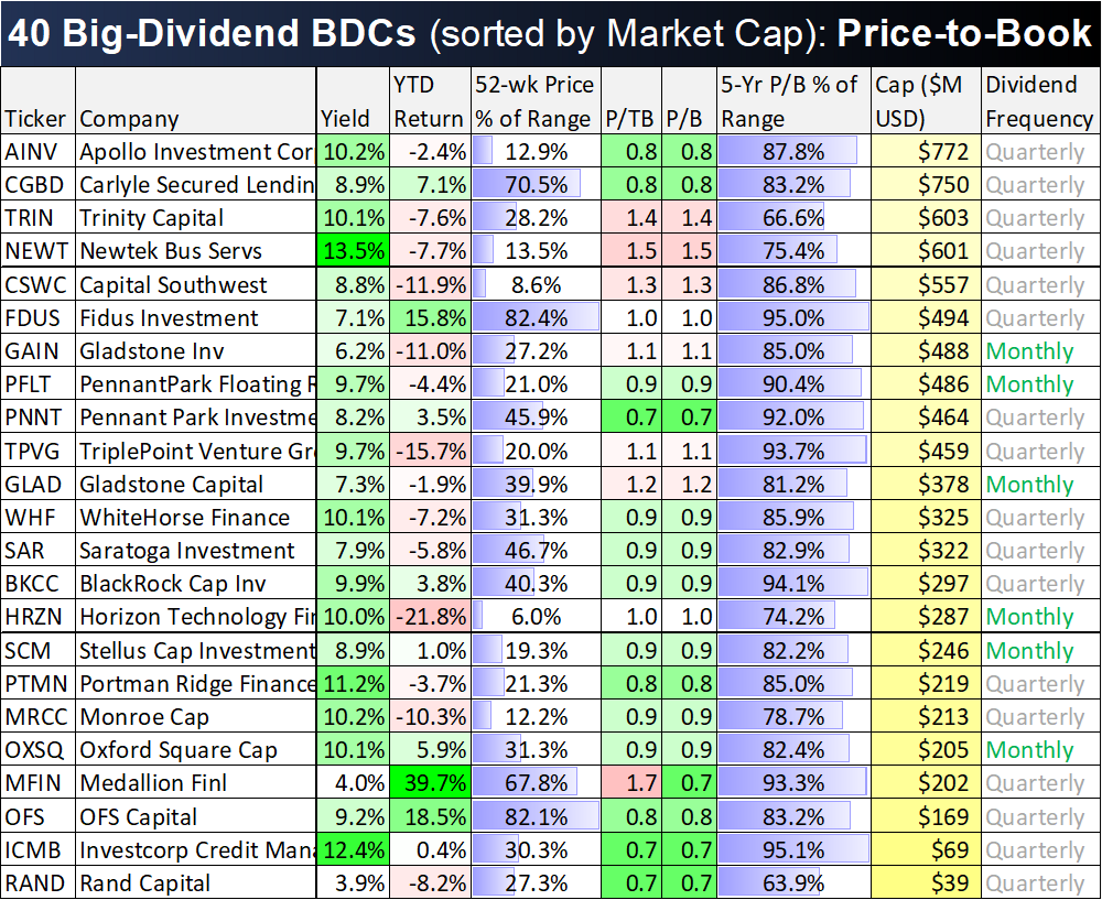 A lot of big-dividend BDCs are down this year and sitting closer to their 52-week lows than their 52-week highs. But that doesn’t necessarily mean they are good buys. In fact, one of the most common BDC valuation metrics (price to book value) shows these same BDCs aren’t necessarily that cheap; this means that this year’s price declines have been accompanied by book value declines (as at least some BDC investments have been written down or sold off).