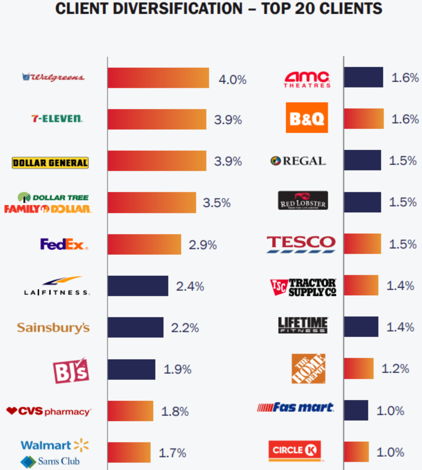 The portfolio is diversified across tenants, industries and geographies. Nearly 96% of its rental revenue comes from tenants with a nondiscretionary service and/or a low price point component to their business. These tenants are resilient to economic downturns and significantly isolated from e-commerce pressures (from the likes of Amazon, for example).