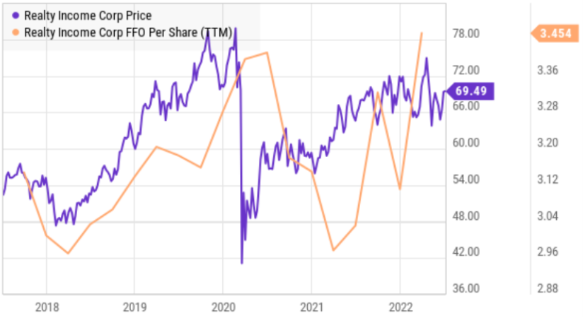 And very importantly, you can see in this next chart that Realty Income’s valuation is also attractive by historical standards. For example, recent FFO per share exceeds levels before the pandemic, yet the share price does not, another indication that Realty Income currently trades at an attractive price-to-FFO mutliple.