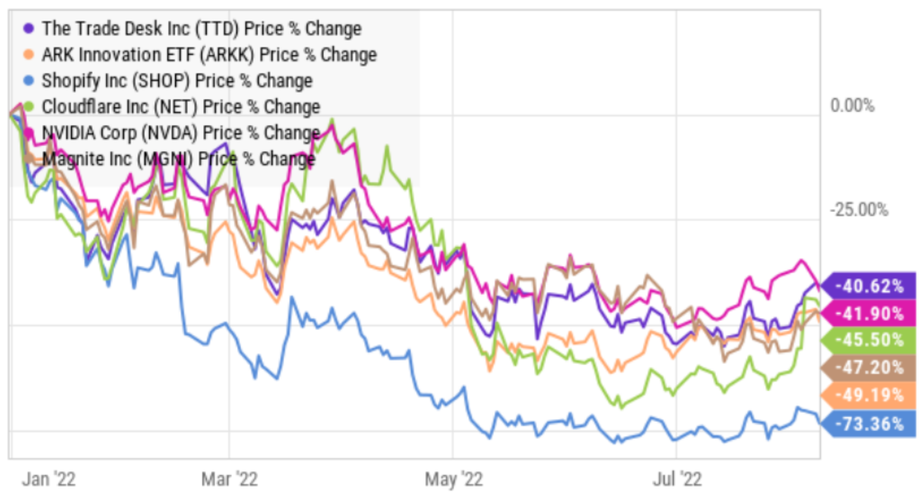 The Trade Desk (TTD) reported strong results (particularly strong revenue growth) in its latest quarterly release on Tuesday. But despite the latest gains, the shares will likely crash again soon. In particular, high-growth stocks (like The Trade Desk) have rebounded hard since mid-June, but are still down dramatically year-to-date, and Wednesday’s newly released inflation numbers will likely embolden the fed in its fight against inflation (which is particularly bad news for high-growth stocks). In this report, we review the ugly top-down environment for five top growth stocks (including The Trade Desk) that will likely crash again soon, then dig into the details on The Trade Desk in particular (including its business, the latest earnings release, its current valuation and the big risk factors) and then finally conclude with our strong opinion about investing in The Trade Desk and top growth stocks in general.