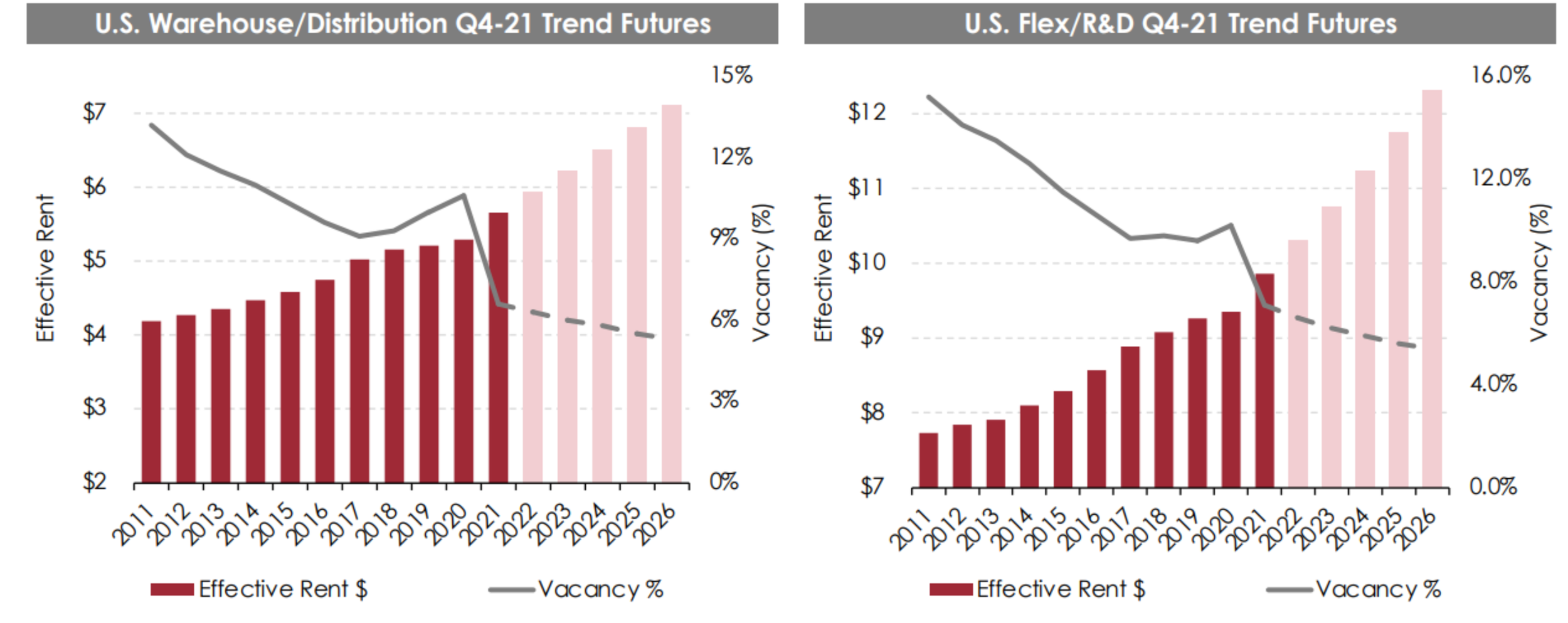 Industrial real estate continues to have a healthier outlook than other industries (such as retail, office) thanks to secular market trends. For example, as retail real estate demand declines (because people continue to shop more online) industrial real estate demand increases (as part of the online shopping infrastructure).