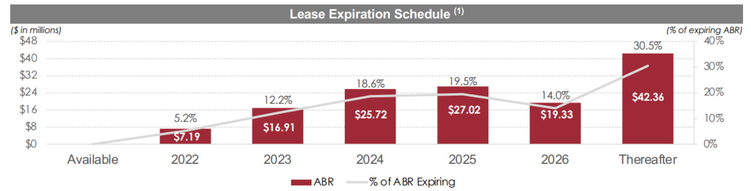Also compelling to note, releasing rates have been increasing significantly (a good thing for Plymouth). For example, in the first quarter of 2022, Plymouth retained 73% of its expiring leases and increased rent by an average of 12.6%. And the other 27% of leases to new tenants saw rent increases of 29.7% on average. What’s more, there is more room for leasing rate increases as a steady flow of expirations will be up for new (higher) rents in the years ahead.
