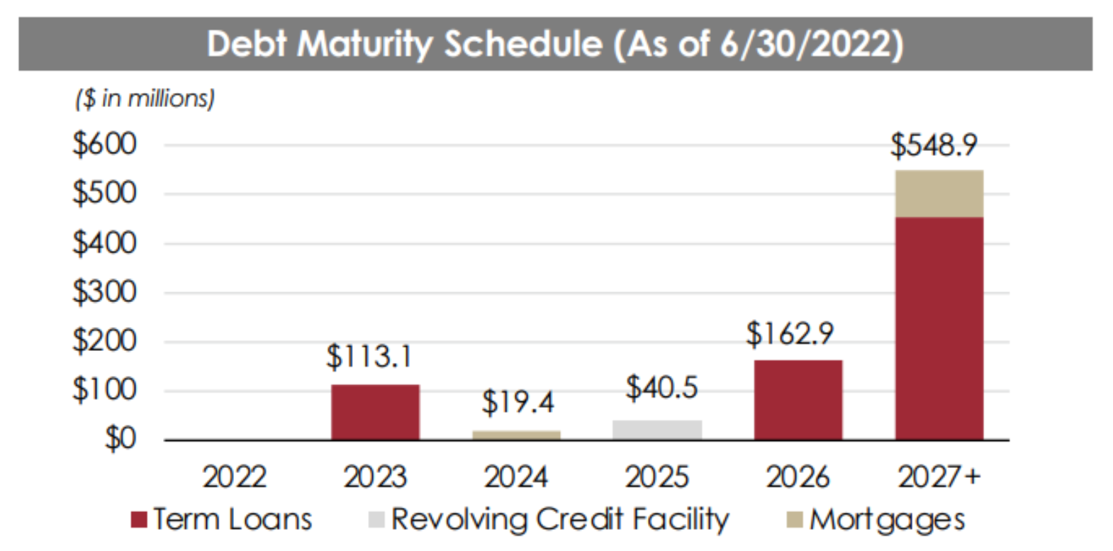 Plymouth has continued to strengthen its balance sheet and improve its liquidity position. For example, the company recently announced the terms for a conversion of a large amount of preferred shares for common shares (and some cash). This puts the company in a stronger position financially (the common dividend is less than the preferred dividend). Further, roughly 95% of the company’s debt is now fixed rate, which can be particularly attractive (and reassuring for investors) in a rising interest rate environment (such as now). For reference, here is a look at the company’s well laddered upcoming debt maturity schedule.