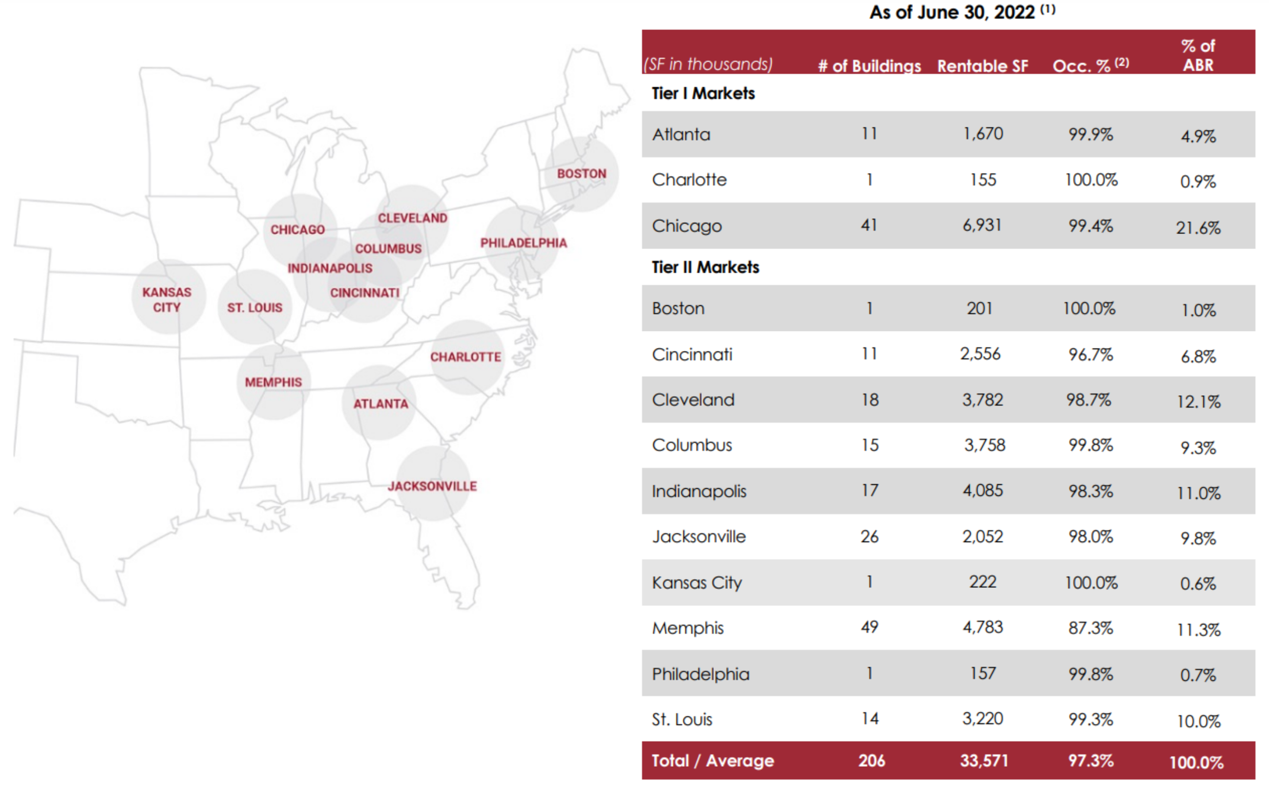 Plymouth’s properties are located in primary and secondary markets within the main industrial, distribution and logistics corridors of the United States. In particular, Plymouth currently owns and manages 207 buildings containing over 34 million square feet in 13 markets.