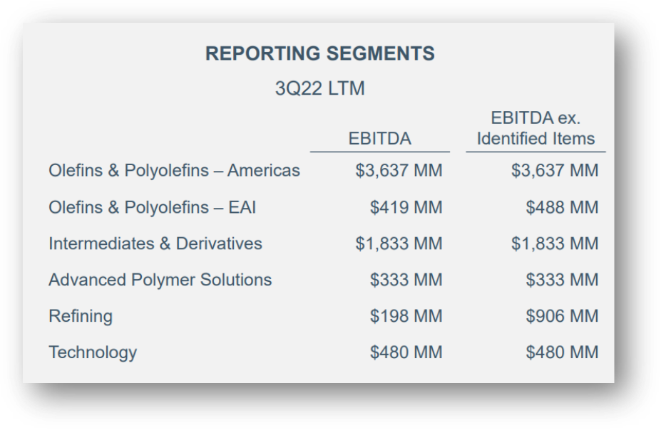 Interestingly, LYB has plans to close its refining business, a smaller segment (see chart above) and apparently the the least cohesive of its six operating segments (also, the refining segment has not been profitable in recent years). The firm plans to cease operations this year and is considering refurbishing it (e.g. recycling and renewables) or potentially selling it. Again, refining, is a relatively small segment.