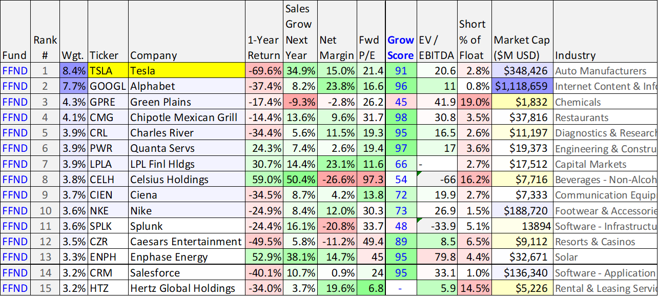 The following tables include the top 10 holdings of two popular growth funds (i.e. Future Fund (FFND) and Ark Innovation (ARKK)), as well as a variety of additional data points that are important considering the current macroeconomic environment (i.e. recession looming and a hawkish fed). Both funds have large positions in Tesla, as you can see below.