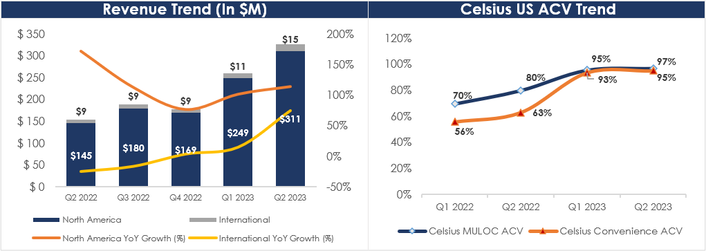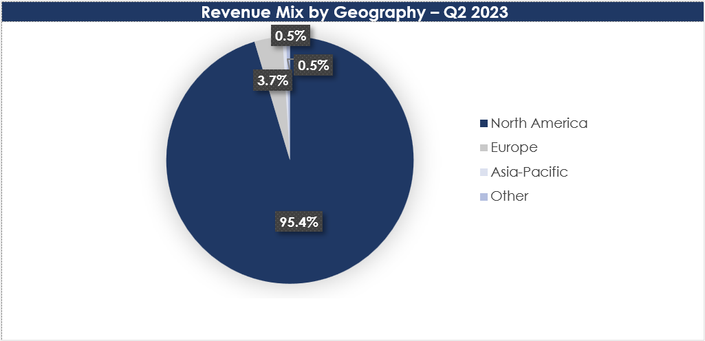 In Q2 2023, total revenue increased 112% YoY to $326M. This growth was driven by the company’s primary North American business which recorded revenues of $311M, marking a remarkable 114% YoY increase. International revenue also displayed strong growth, surging by 76% to reach $15M, reflecting a recovery from the previous year's challenging business environment.