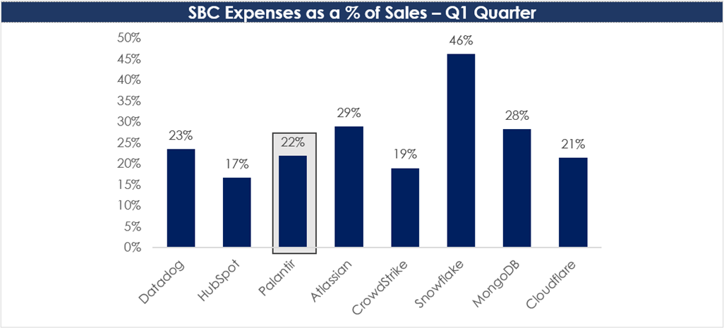 Also worth noting, even though it is a non-cash item, Palantir’s SBC (as a percent of sales) is now on par with other high-growth technology companies, as you can see in the following chart.