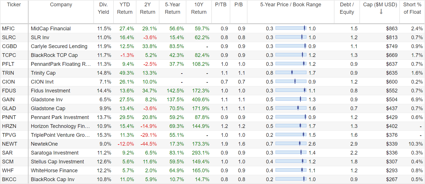 You likely recognize many of the names in the above table. Also worth mentioning, you can see the price-to-book value for each BDC (this is a common high-level BDC valuation metric, but of course there is a lot more to analyzing a BCD than simply its P/B ratio).