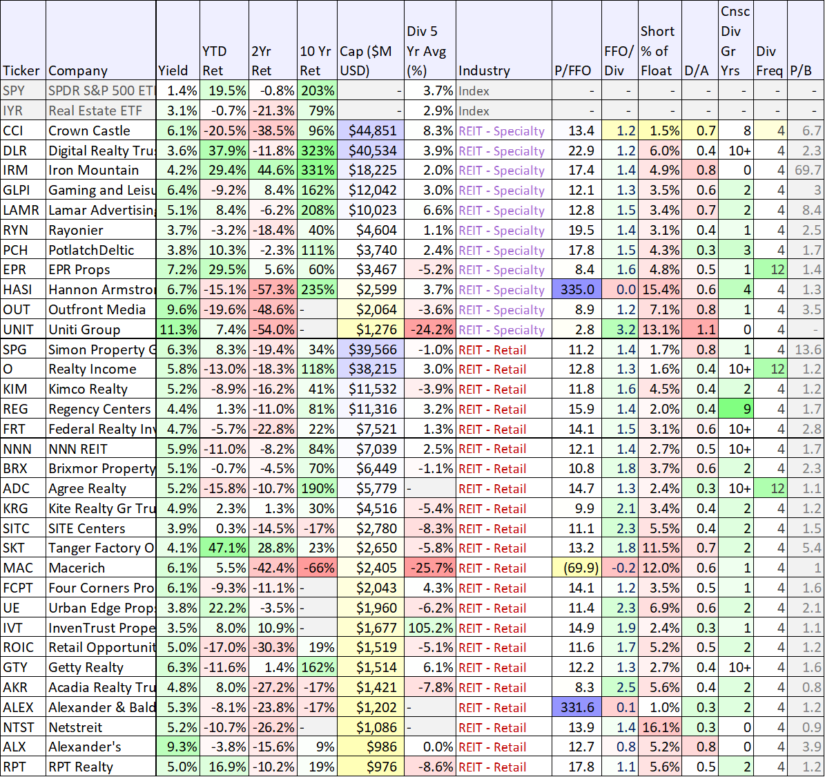 Starting with big-dividend REITs, you can see in the following table that performance for the group has been horrendous over the last two years (for some groups more than others). The unusual 1-2-3 punch of rising interest rates, an uncertain economy and the winds of secular change (for example, work-from-home and online shopping) have all played a big part.