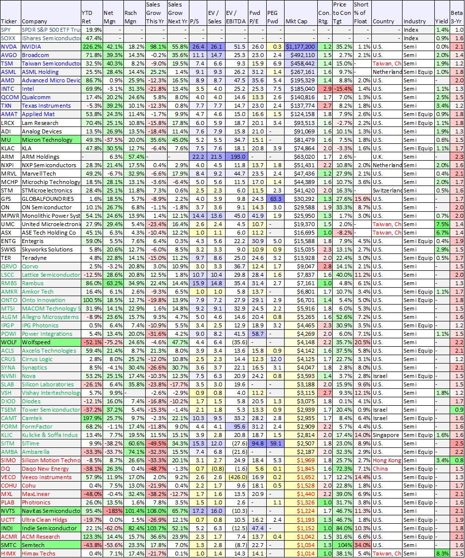 Some of the most interesting data points in the above table (chip stocks sorted by market cap) are short interest and expected sales growth for next year. You can also see a variety of of valuation and performance data too.