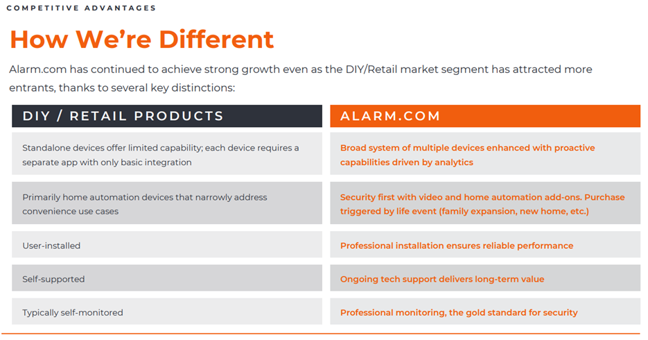 Alarm is unique versus multiple types of competitors. First, it’s mainly a software company (it provides a small amount of hardware too), and this provides distinct advantages versus competitors that install security hardware too. Specific advantages of this business model include: