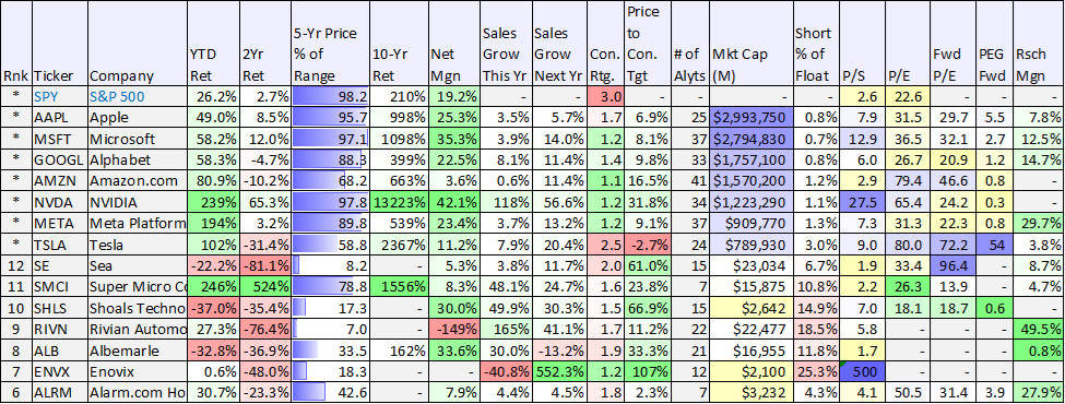 So with that backdrop in mind, let start with some data on the second tier stocks in our top 10 rankings (i.e. the names ranked #10 down to #6). For comparison purposes, you can see the same data for this group, as compared to the “Magnificent 7,” in the following table.