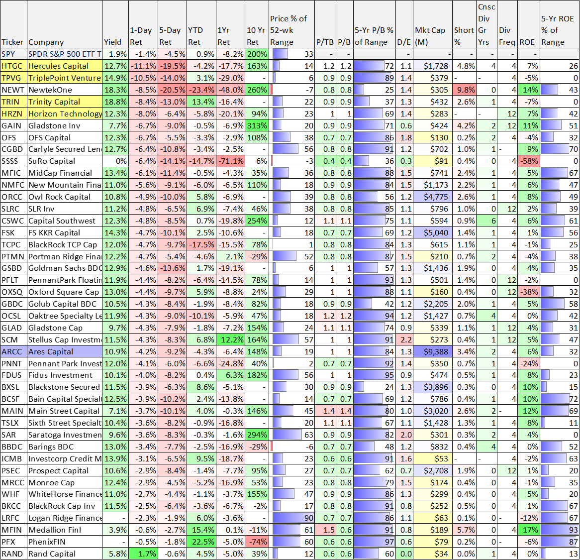 And as you can see in the following table (data as of Friday’s close), BDCs have had a mixed start to 2023. In particular, you’ll notice the four BDCs highlighted in yellow are down a lot over the last few days because those are the ones heavily concentrated in the VC space (i.e. the same space as Silicon Valley Bank that just collapsed).