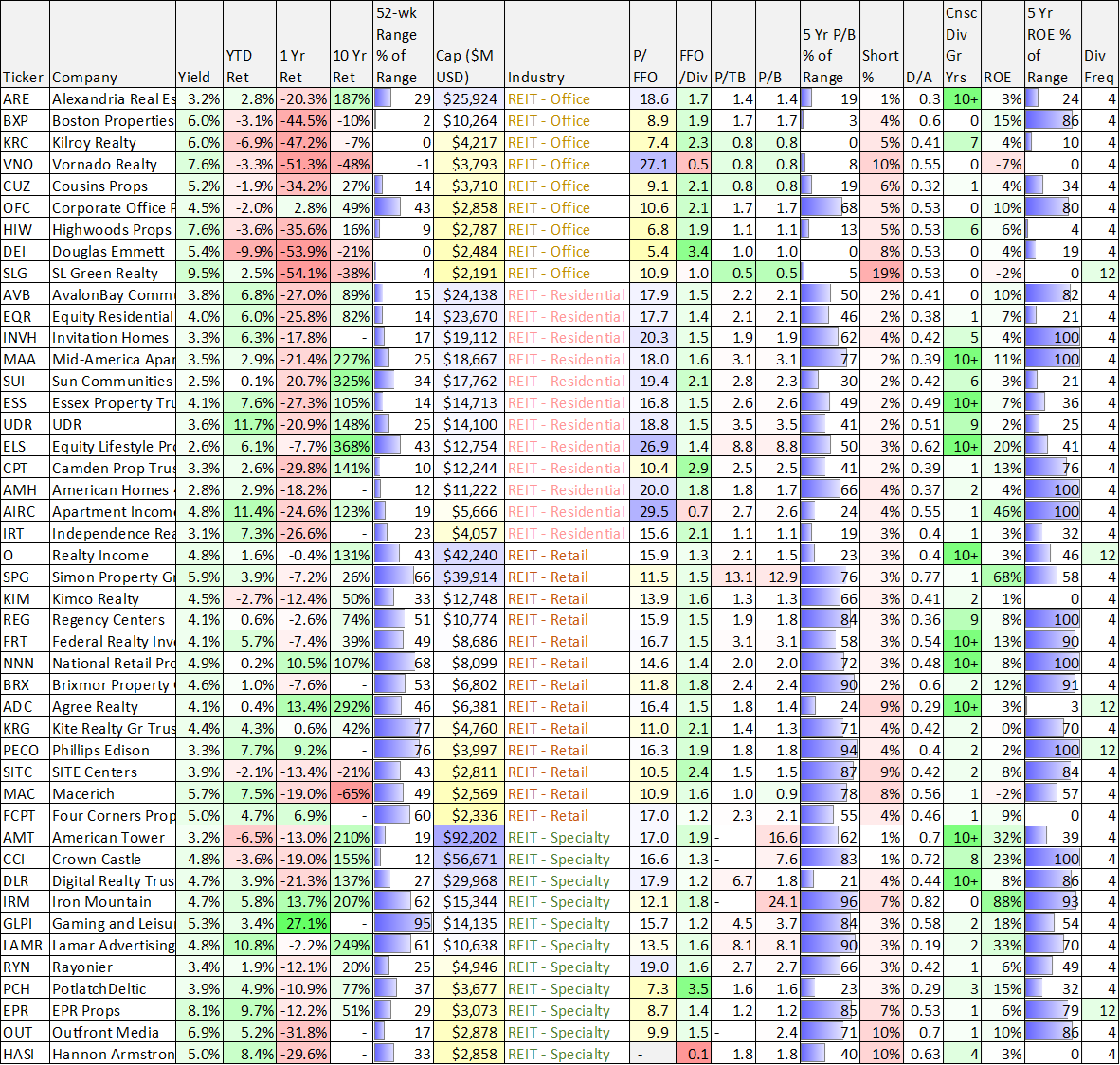 Quick Note: Sharing updated data on 80+ REITs, sorted by industries. As you can see, residential properties’ 1-year performance has been ugly, and unsurprisingly—office properties have been even worse.