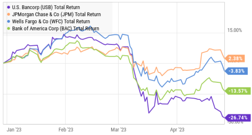 Specifically, as you can see in the above chart, most banks fell sharply following the recent Silicon Valley Bank failure, but unlike other banks—USB hasn’t really rebounded. One big reason the shares are still down is the risk of a dividend cut, as described in the next section.