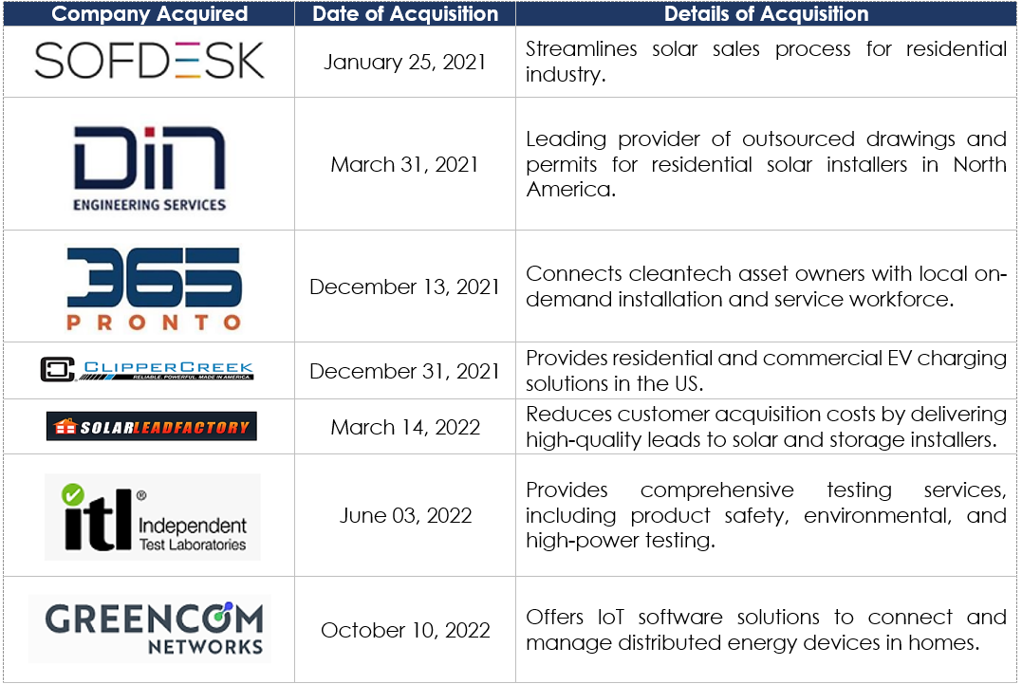Enphase ended Q1 2023 with $1.8B in cash, cash equivalents, and marketable securities. It also had debt of $1.3B, which is well covered by its current liquidity. The company has clear capital allocation priorities, focusing on business needs, advantageous mergers and acquisitions, and potential share buybacks if cash is available. Recent acquisitions have fueled the company's growth, as shown in the table below.