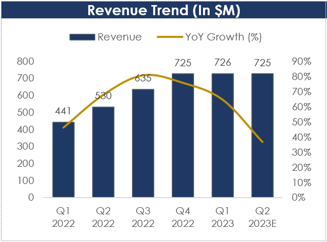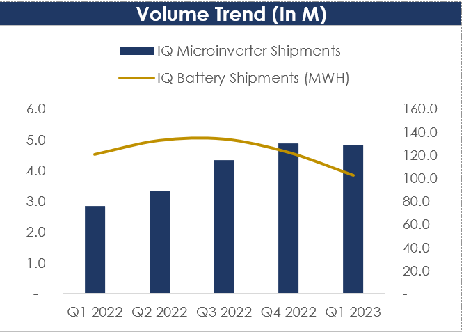 In Q1 2023, the company’s revenue rose 65% YoY to $726.0M, fueled by a significant 70% YoY rise in unit shipment of microinverters, with 4.8M units sold in Q1 2023 versus 2.8M units in Q1 2022. The Average Selling Price (ASP) of its microinverter products also increased by 6% YoY in Q1 2023, contributing a $26.8M YoY increase in revenue. The rise in ASP was primarily driven by a favorable product mix with the company selling more IQ8 microinverters (advanced version) relative to IQ7 microinverters.