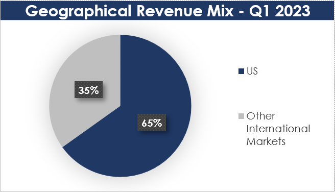 Enphase’s geographical focus extends to residential and commercial markets in the US, Canada, Mexico, Europe, Australia, New Zealand, India, Brazil, the Philippines, Thailand, South Africa, and selected Central American and Asian markets. With a global presence, the company has supplied ~63M microinverters and installed over 3.3M residential and commercial systems in more than 145 countries worldwide as of March 2023. Enphase is proactively expanding its global presence. In fact, the company's revenue share from the US has decreased from 84% in 2017 to 76% in 2022 and 65% in Q1 2023, as shown in the following pie-chart.
