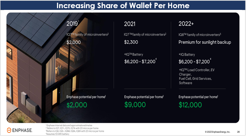 Enphase has a strong track record of continuous innovation, evident in its core microinverter technology, as well as its strategic expansion into new product offerings. A notable addition to its portfolio is the IQ Battery launched in 2021, which offers optimized energy utilization, enhanced energy independence, and reliable backup power during grid outages. What sets Enphase IQ Batteries apart is their utilization of AC coupling, ensuring seamless compatibility with various solar installations and inverters. Additionally, the company’s commitment to innovation is further demonstrated by the introduction of other innovative products in 2022, leading to a substantial increase in its potential earnings per home.