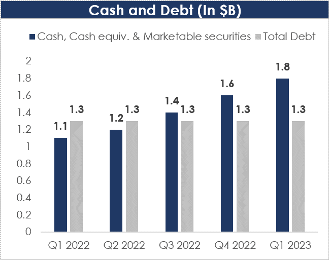 In Q1 2023, Cash Flow from Operations (CFO) grew to $246.2M from $102.4M in Q1 2022, led by improved profitability. Capital expenditures increased 82% YoY to $22.5 in Q1 2023, on increased manufacturing in US. Resultantly, Free Cash Flow (FCF) improved to $223.8M in Q1 2023 from $90.1 in Q1 2022.