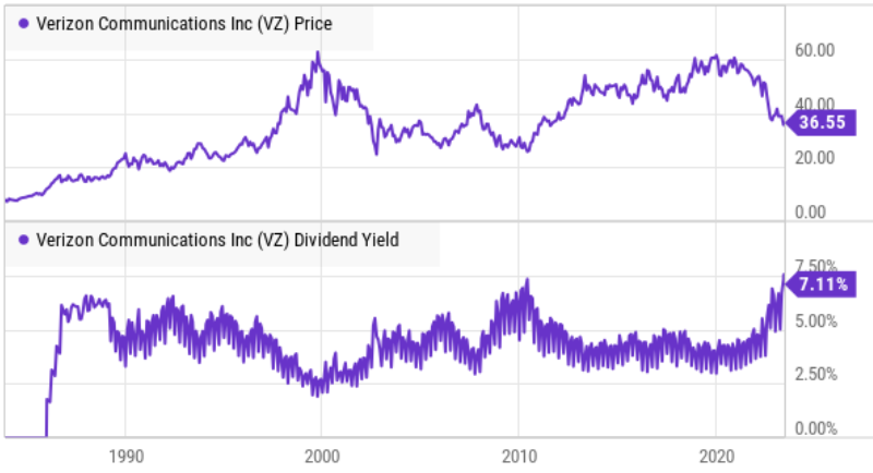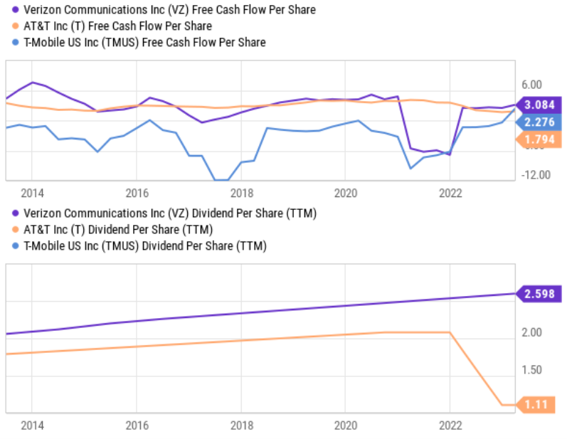 You can see important dividend-related metrics (for Verizon, AT&T and T-Mobile) above, such as current (and historical) yield (Verizon’s is current attractively high), dividend coverage ratio (as compared to earnings) and share outstanding (Verizon hasn’t been diluting existing shareholders by issuing new shares like AT&T and T-Mobile).
