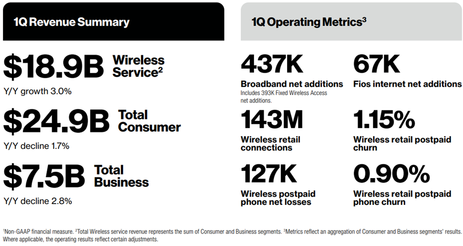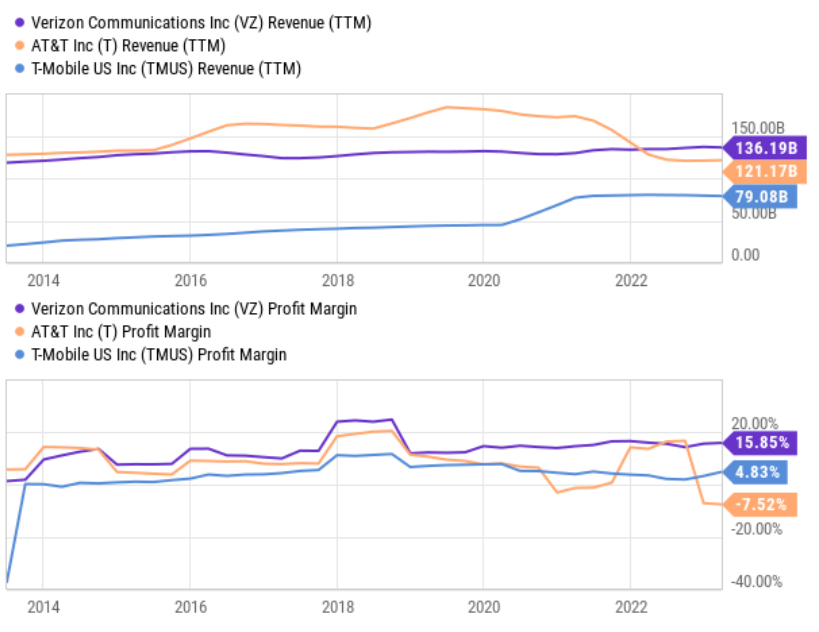 Verizon divides its business into “Consumer” and “Business” segments, but it’s really better understood as wireless versus wireline. Specifically, Verizon’s wireline business is in decline and expensive to maintain, whereas the wireless business contributes virtually all of the company’s overall profit (the net profit margin was recently 15.85% (superior to AT&T and T-Mobile).