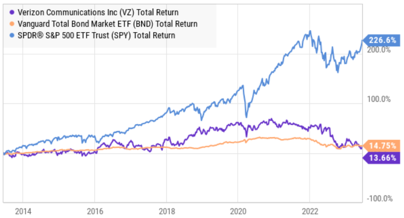 Also worth noting, while Verizon’s valuation and dividend yield are both attractive (as we will cover in more detail below), its future growth expectations are low (as you can see in the table above). Verizon is not a high-flying growth stock, but rather it is an attractively-priced, low-beta (recently 0.35) dividend growth stock (the dividend has been increased for 18 years in a row). And a lot of investors have historically purchased the shares as a bit of a bond proxy. As you can see below, Verizon’s total return (price gains plus dividends reinvested) over the last decade has been a lot closer to a bond market index (BND) than a stock market index (SPY).