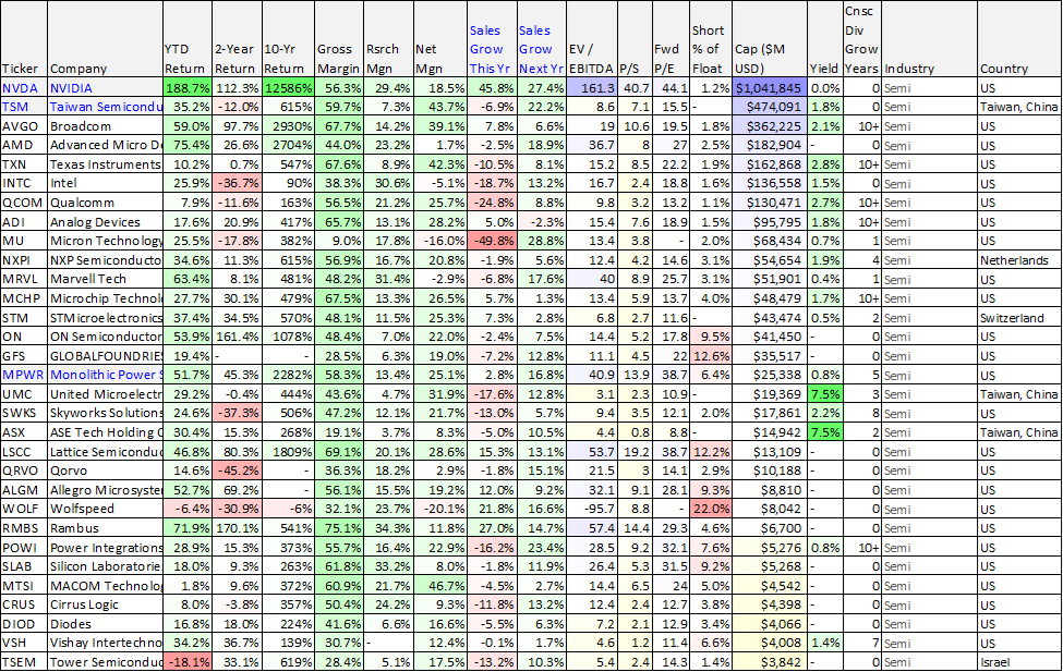 For a point of reference, and so we can refer back to it throughout this report, here is data on 30 of the largest semiconductor stocks (sorted by market cap).