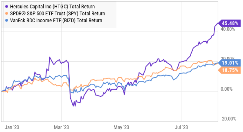 There are a few likely explanations for the currently rich Hercules valuation. For starters, the shares have been rallying hard since they crashed earlier this year as Silicon Valley Bank failed (many growth-focused BDCs fell particularly hard at this time because of contagion fears—SVB and growth-BDCs often had many of the same clients), and investors have perhaps gotten carried away (and the shares are simply overpriced now—as supported by the high short interest in our earlier table).