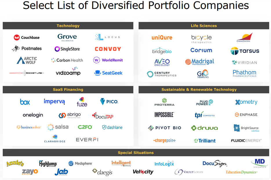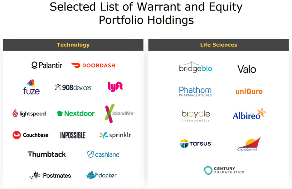 Also worth noting, Hercules provides mostly senior secured first lien loans (which are safer as compared to second position or unsecured loans). And the company also does have some equity and warrant positions too (thereby providing additional future upside for shareholder’s total returns). For a little more color, you can see select examples of Hercules portfolio companies in the graphics below.