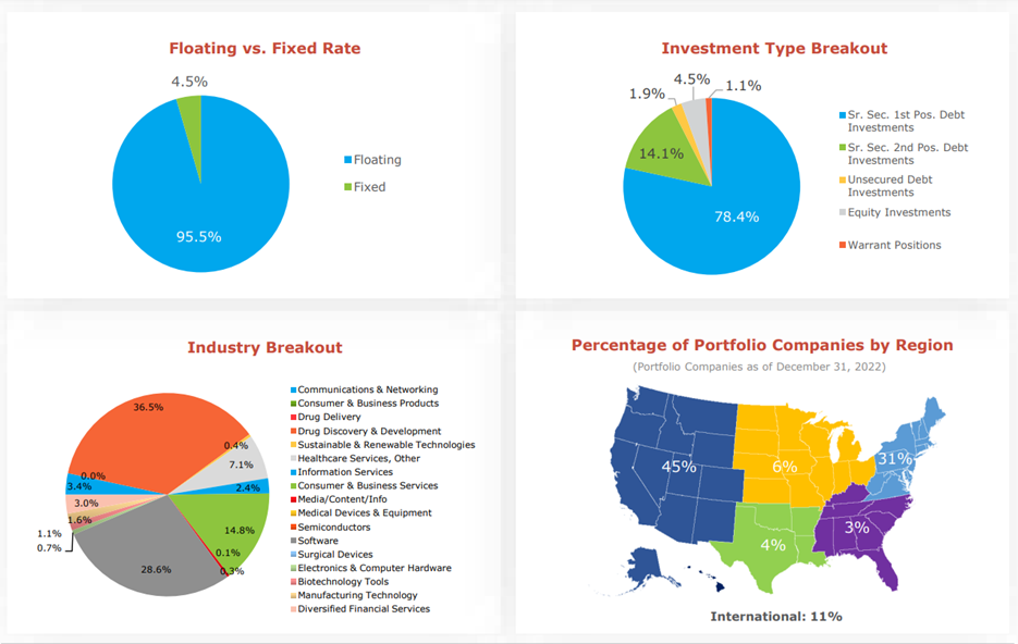 As you can see below, the majority of the loans provided by Hercules are floating rate (a good thing in a rising interest rate environment) and they are diversified across a variety of industries and geographies (easier for Hercules to do considering its relatively larger size as compared to most other BDCs).