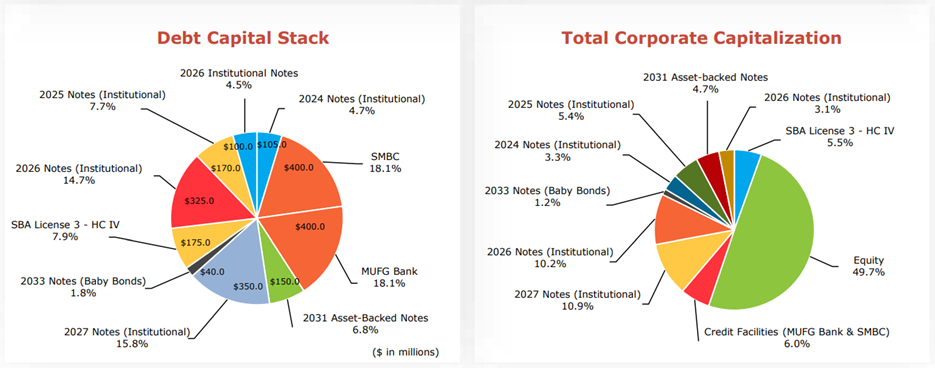 Also, although Hercules currently benefits from lower fixed rate borrowing, those loans will eventually mature and require new financing (likely at higher rates). You can see the company’s current debt capital stack (including maturity dates/years) in the following graphic.