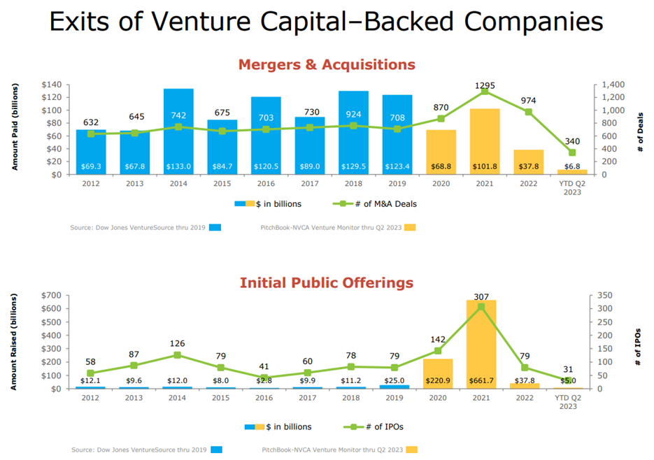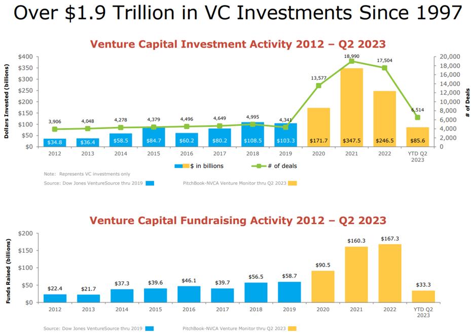 For some perspective, here are a few charts (above and below) showing how venture-capital (high growth) company investments can speed up and slow down with the market cycle. For example, notice activity was very high during the 2020-2021 pandemic “growth” bubble, but very slow so far this year.