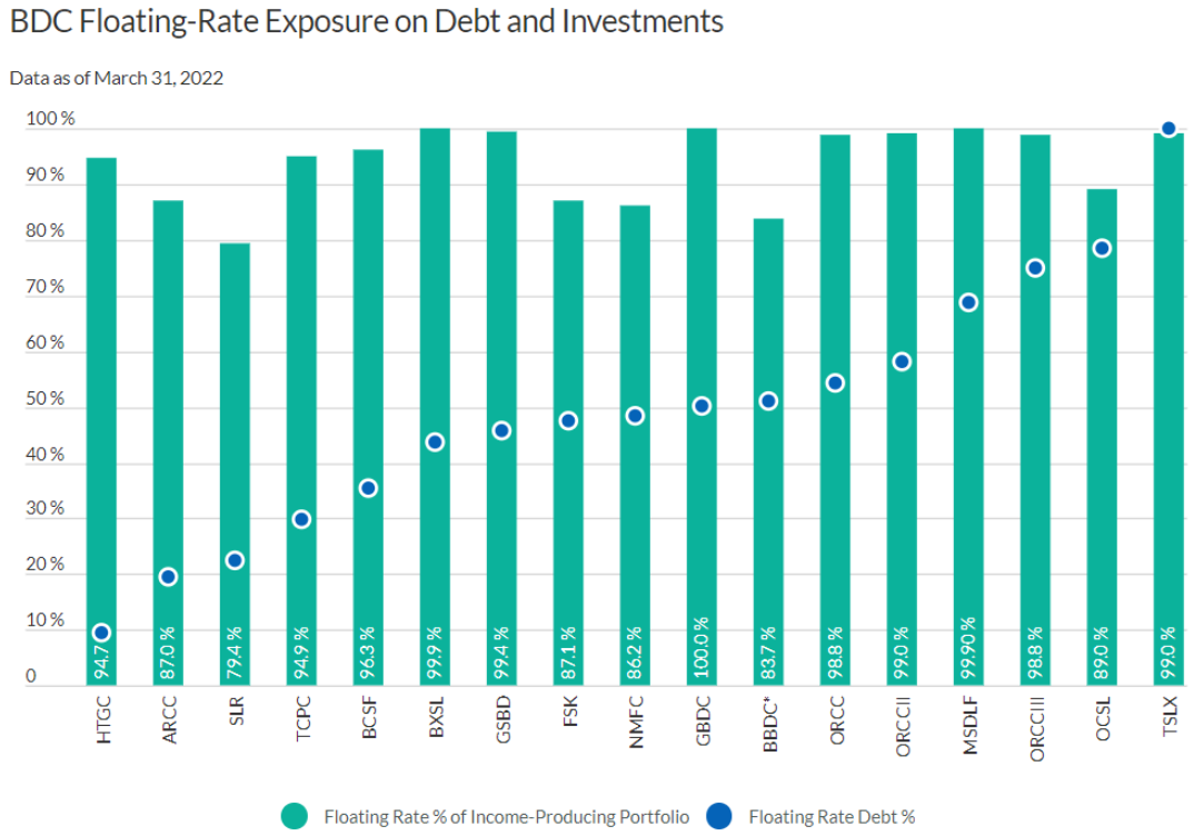 Yet another explanation is that as interest rates have risen, investors expect Hercules to benefit more than other BDCs because of its much higher “floating rate” portfolio. For perspective, this next chart is from last year, but it gives a good illustration of just how far out there Hercules is with regards to floating rates as compared to peers.