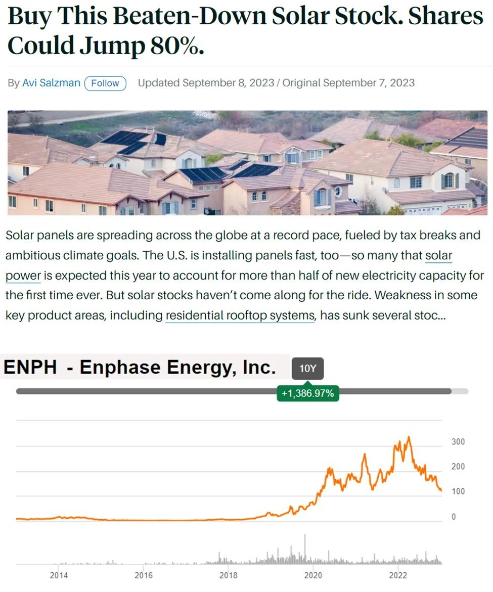 For a little color, the shares are down for a few reasons, but mainly because higher interest rates and a soft economy are slowing growth. We believe this is temporary, and the long-term secular trend is fully intact. We are long Enphase in our Disciplined Growth Portfolio.