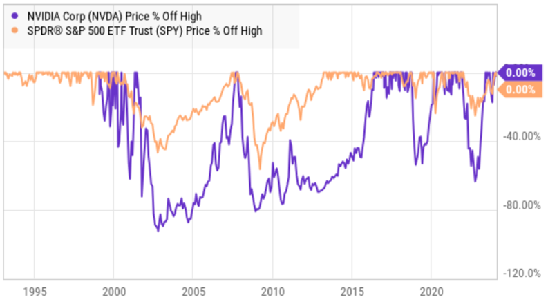 However, before you go dumping your life savings into Nvidia, just know that the semiconductor industry is highly cyclical. For example, you can see in the following chart that Nvidia shares have fallen more than 50% (from their all-time highs) four times in the last two decades (and twice the share price fell by 80% or more!). As you can see by comparing Nvidia to the S&P 500 (below), Nvidia shares have been dramatically more volatile.