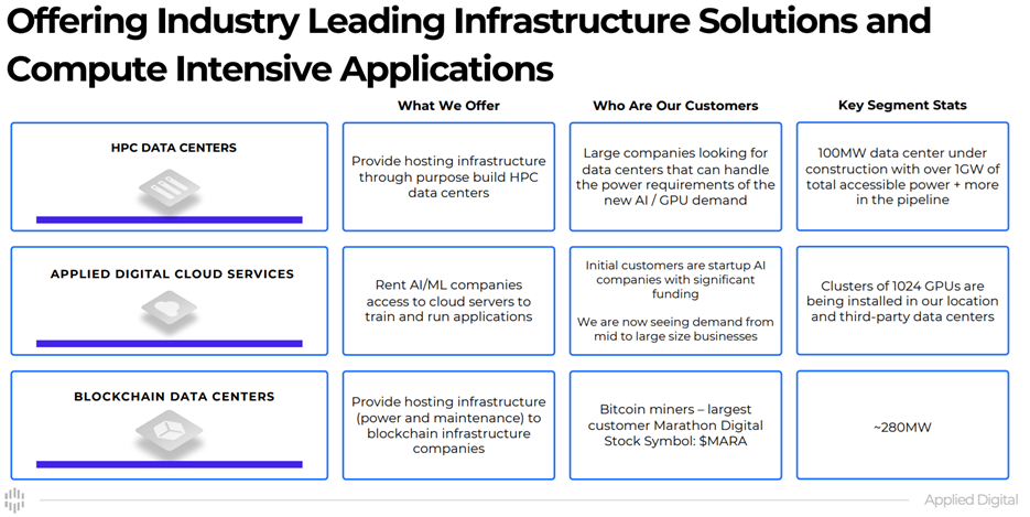 Applied Digital develops and operates next-generation datacenters for the rapidly growing high performance computing (“HPC”) industry. The company believes its solutions are better suited for “compute intensive applications” (such as AI), and it believes the demand for such datacenters will drive customers to Applied Digital soltuions.