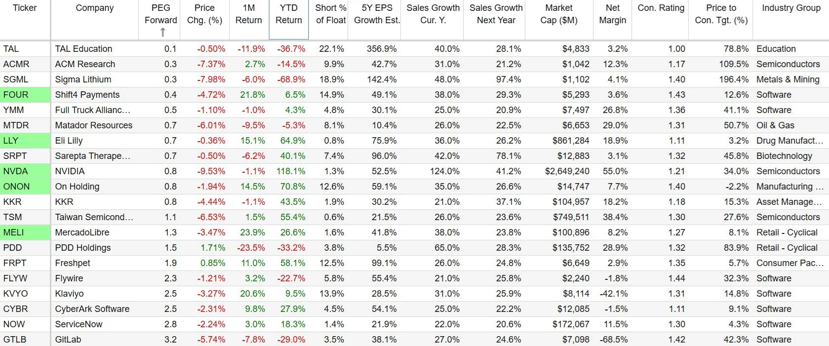 Sharing some updated data. Of "highly rated" stocks w/ >20% Sales Growth (this year & next) sorted by Fwd PEG, these 5 standout as most interesting.