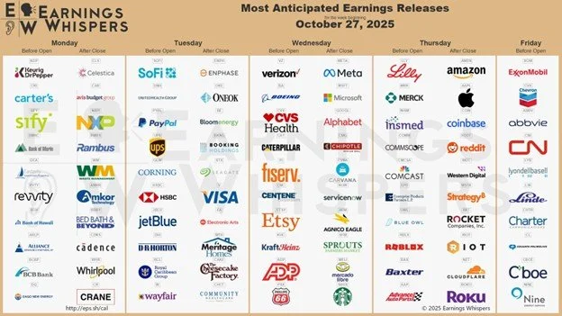 Looking ahead, as the stock market closes out a “resilient” October (amid ongoing U.S. government shutdown disruptions and simmering U.S.-China trade tensions) the week of October 27-31, 2025, promises heightened volatility driven by blockbuster Big Tech earnings reports, including Alphabet (GOOGL), Microsoft (MSFT) and Meta (META) on Wednesday, and Amazon (AMZN) and Apple (AAPL) on Thursday, which together represent about a quarter of the S&P 500's weighting and could dictate the index's trajectory toward a potential push above 7,000 by year-end. Be ready for sharp swings if results underscore AI-driven growth or expose vulnerabilities in consumer spending, especially as supply chain frictions from tariffs linger despite economic realities tempering their immediate bite.