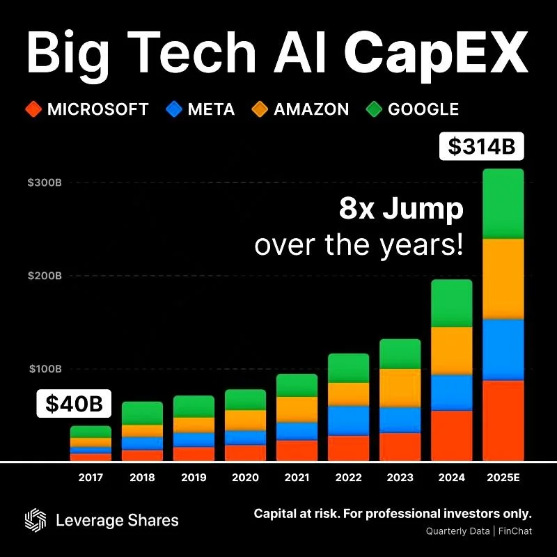 When it comes to building out AI capacity, several big tech companies reign supreme (see AI Capex graph below). And this is a massive leading indicator of what is to come (i.e. lots of ongoing AI development and growth).