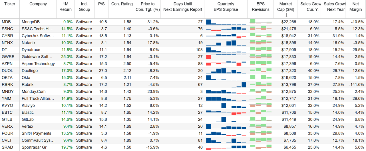 In particular, names that stand out include: Palo Alto Networks (PANW), HubSpot (HUBS), Monday (MNDY), JFrog (FROG), Shift 4 Payments (FOUR), Zeta (ZETA), Okta (OKTA), GitLab (GLAB), CrowdStrike (CRWD), Zscaler (ZS) and MongoDB (MDB).