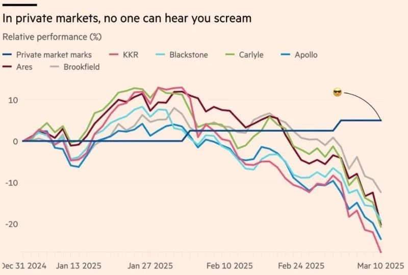 For starters, here is a look at the relative performance of private equity “marks” versus publicly-traded private-equity firms. It appears the private market investments have completely missed the recent public equity markets selloff?…