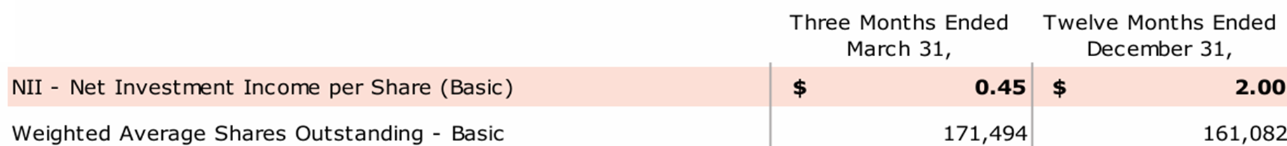 And from a financial statement standpoint, Hercules’ net investment income per share has consistently exceeded its dividend payout (a good thing). For example, last quarter’s $0.45 net investment income exceeds the ordinary dividend amount of $0.40 (see graphic below), plus Hercules sometimes pays a special (extra) dividend too (as you can see in the light gray versus dark gray in our earlier dividend graphic).